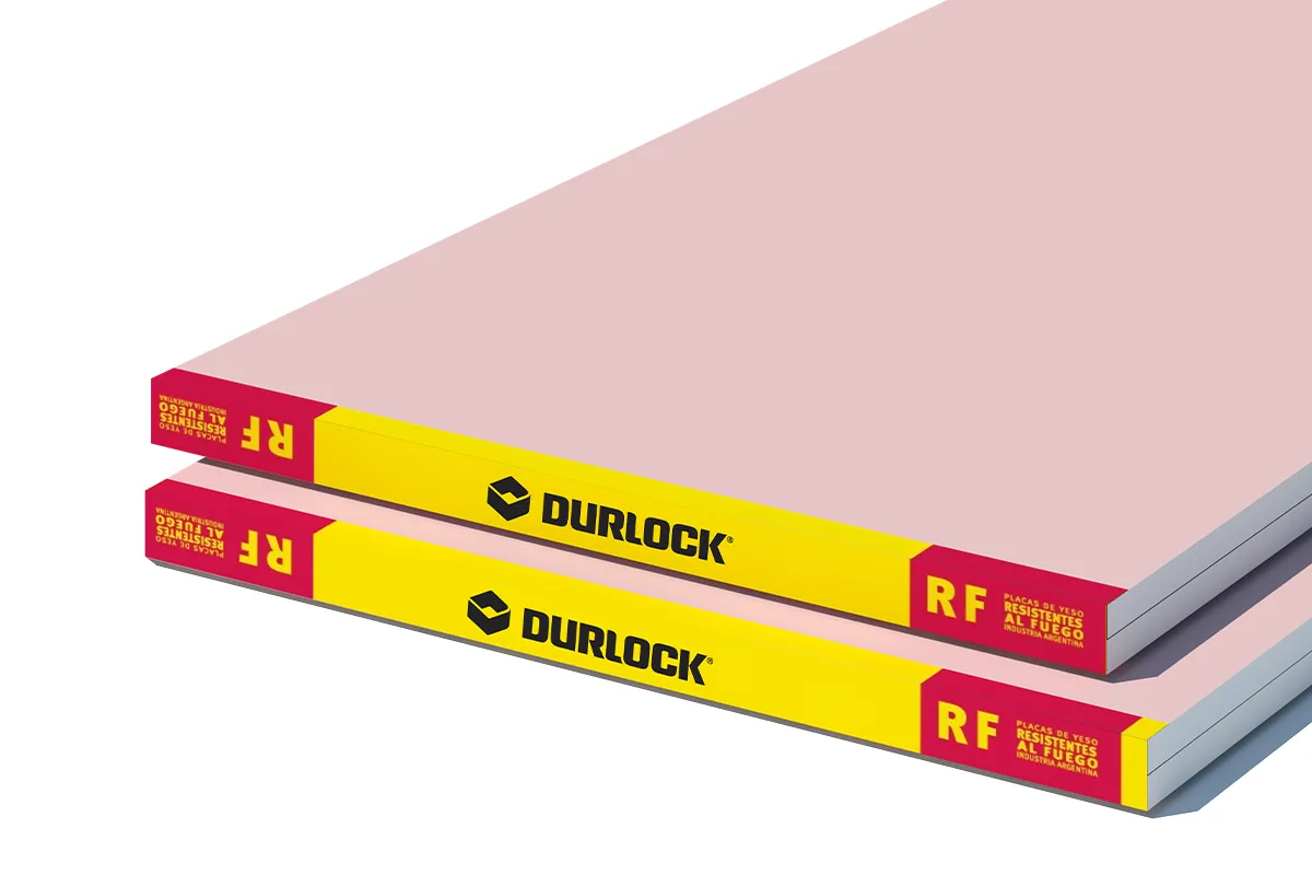 El núcleo de las placas de yeso Durlock® Resistentes al Fuego tiene la incorporación de aditivos especiales que proporcionan una mayor resistencia al mismo, preservando el mayor grado de integridad de la placa bajo su incidencia. Las placas Durlock® RF se identifican por su cinta protectora de bordes color rojo, siendo el papel de la cara expuesta de color rosa y el de la cara posterior de color más oscuro.